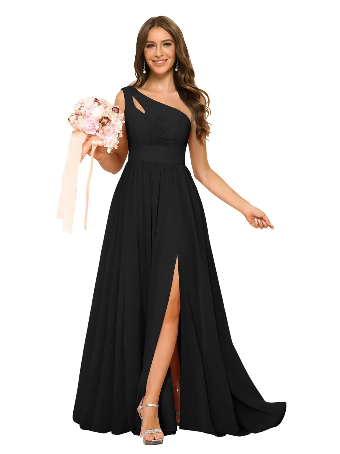 YOFF One Shoulder Bridesmaid Dresses for Wedding 2025 Long Pleated Chiffon Formal Party Dresses with Slit Black 10
