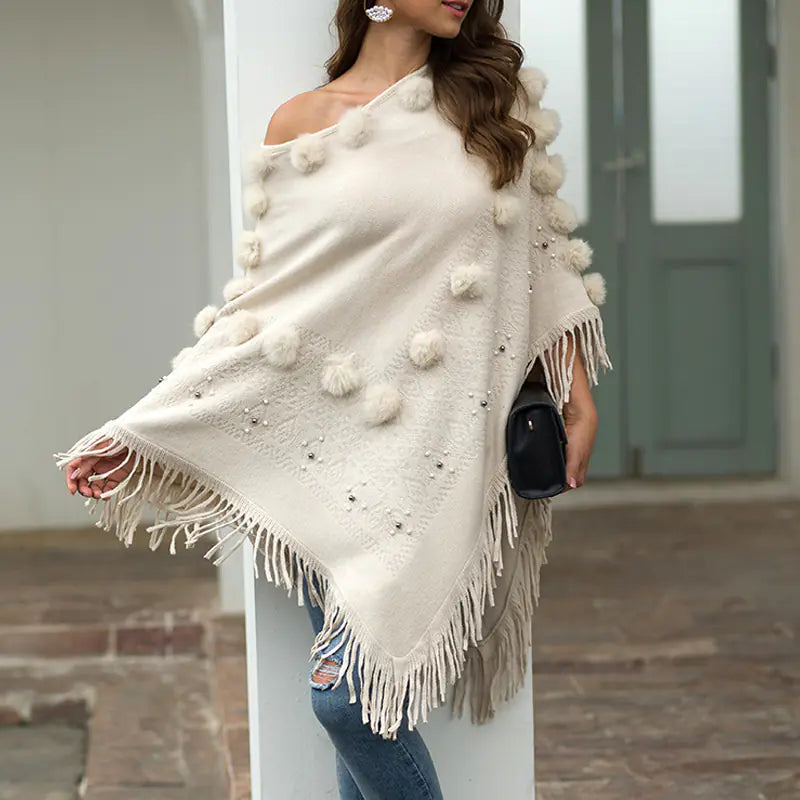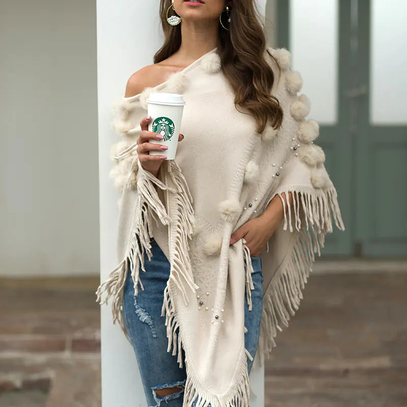 Fringe Shawl Sweater for Women with Beaded Neckline