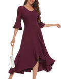 ["This long womens dress features comfortable skin-friendly and stretchy fabric making it ideal for wearing to weddings formal evening events concerts and cocktail parties." The design includes 3/4 length bell sleeves a V-neck a slit design on the skirt and a ruffled hem creating an elegant and flowing look suitable for diverse formal occasions.Perfect for a wedding guest dress this attire embodies sophistication and style making it ideal for attending special events and celebrations. With its versatile design this dress can be worn as a cocktail dress allowing women to exude an air of grace and chic charm at cocktail parties and glamorous gatherings.Simple jewelry and heels is the best way to go for a classy and sophisticated style. This dress is an excellent choice as a formal dress for women perfectly suited for elegant evenings formal banquets and refined social occasions where an elevated sense of style and grace is essential. "Size Matters: Be sure to check our size chart before purchasing to ensure the perfect fit. If youre between sizes we recommend sizing up for comfort."]