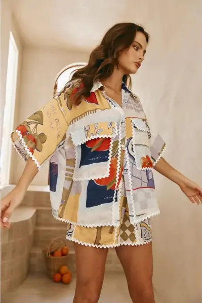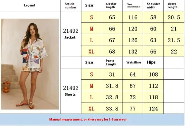 This matching set includes a printed shirt top paired with loose, casual shorts for an effortlessly chic look. The relaxed fit and breathable fabric make it ideal for both lounging and casual outings, offering style and comfort in one. Perfect for summer or vacation wear.
