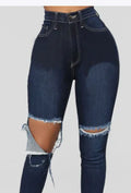 Featuring a solid dark blue color, these jeans are versatile enough to pair with any top, making them perfect for both casual outings and more dressed-up occasions. The ripped detailing adds a trendy edge, ensuring you stay stylish no matter where you go.