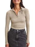 Tankaneo Womens Long Sleeve Polo Shirts V Neck Collared Work Shirt Slim Fit Ribbed Knit Basic Going Out Fall Tops Khaki