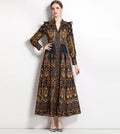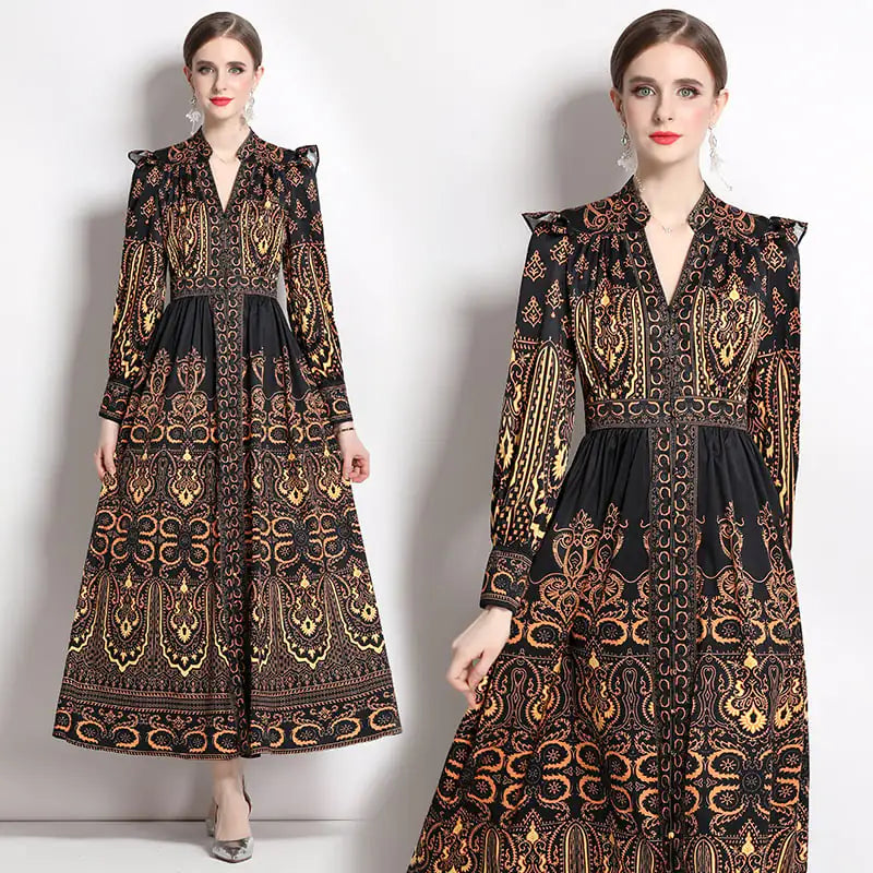 Crafted from high-quality chiffon fabric, this dress is designed for comfort and style. The enchanting black and gold color palette, adorned with beautiful plant and flower patterns, instantly elevates your look. The V-neck design and lantern sleeves add a unique flair, creating a silhouette that flatters all body types.